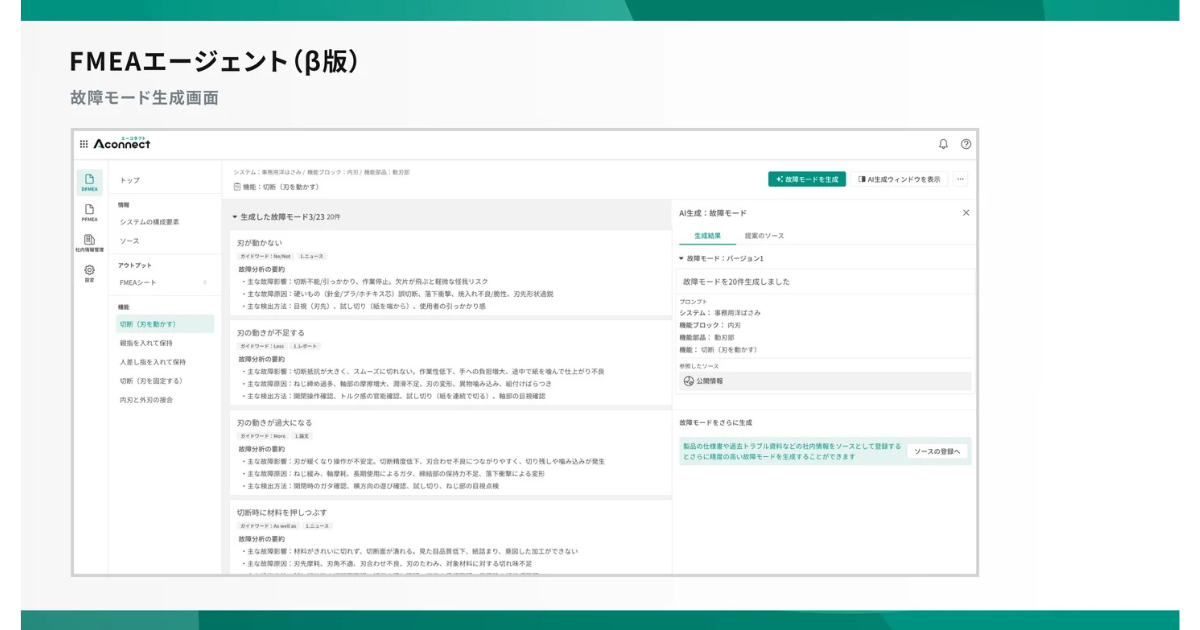 「FMEAエージェント」は、AIによる思考支援を受けながら故障モードの生成や改善策の検討が可能。公開情報データベースや顧客独自のドキュメントを活用し、高精度なリスク抽出を支援する。設計FMEA(DFMEA)にも対応しており、熟練者のノウハウに依存しがちだったリスク検討を型化し、再現性の高いアウトプットを実現することで、若手でも品質を担保した設計検証が可能となる。