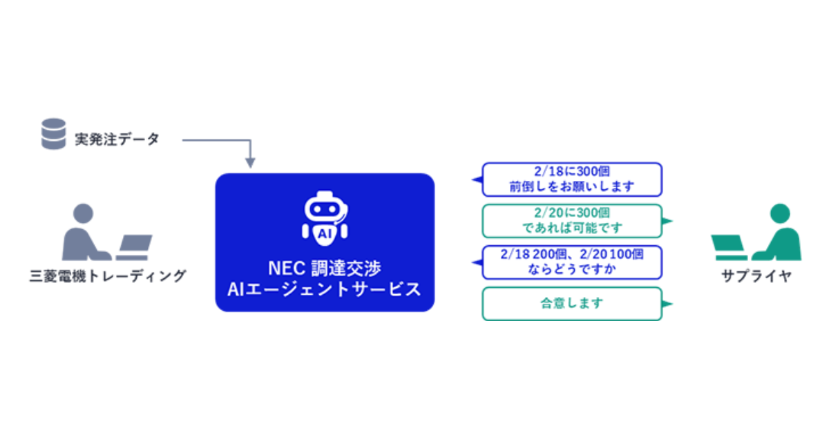 2026年4月15日、NECは三菱電機トレーディングと共同で、NECの「調達交渉AIエージェントサービス」を活用した納期・数量交渉の自動化実証を、2025年9月から2026年2月まで三菱電機トレーディングの国内主要3拠点で実施したと発表した。
