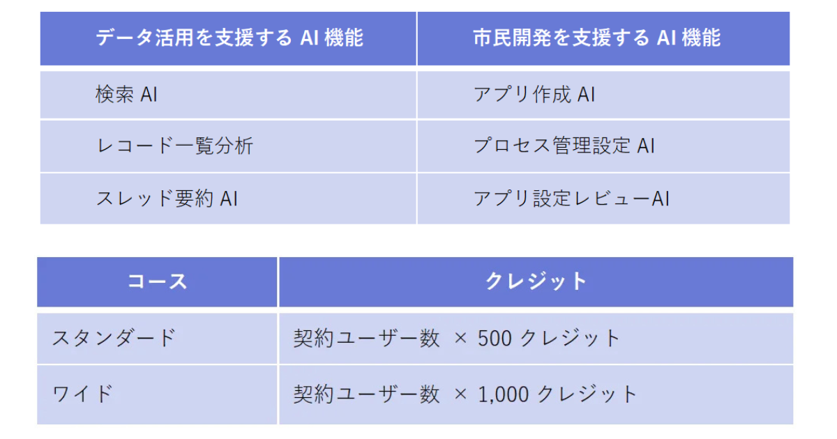 新たに導入されるクレジット制では、kintoneのスタンダードコースまたはワイドコース契約者に、追加料金なしで毎月一定数のAIクレジットが付与される。付与されたクレジットはチーム単位で共有され、各種AI機能を必要に応じて利用できる仕組みである。なお、クレジットが不足する場合の有償オプションによる追加購入は2026年秋ごろ提供予定とされている。