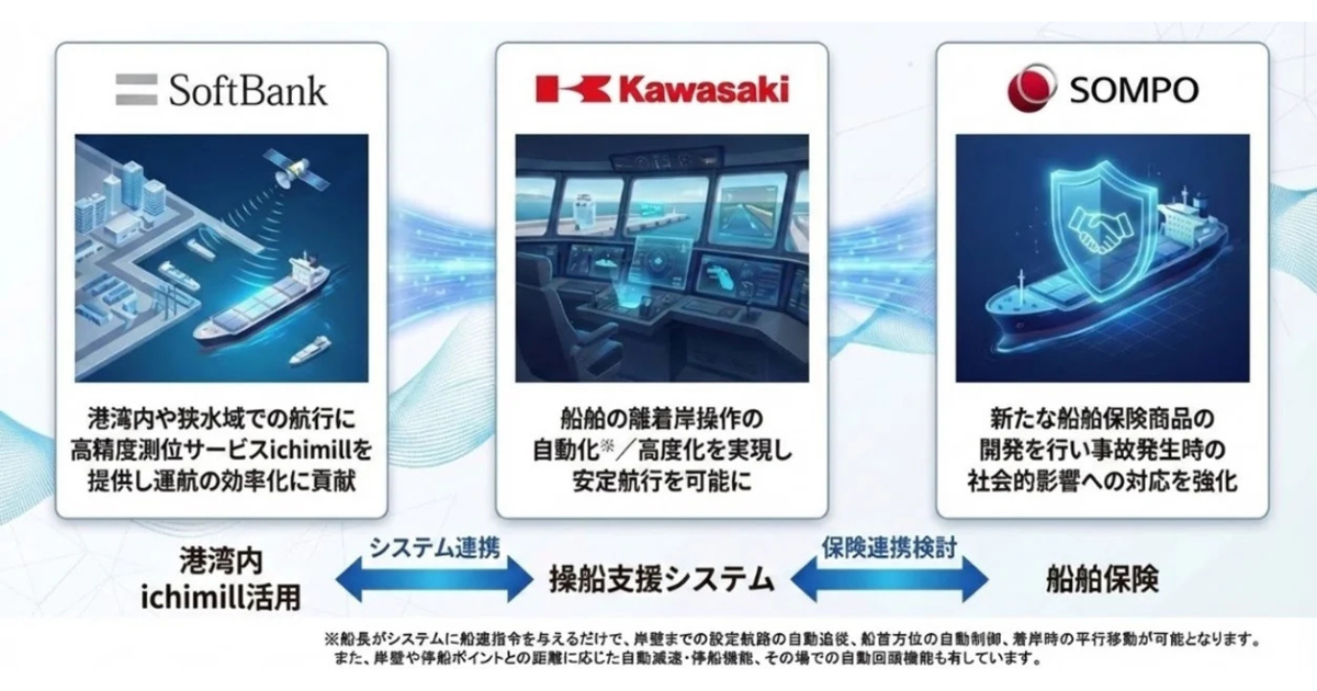 このたびの協業では、川崎重工が持つ「安全離着岸支援システム」と、損保ジャパンの船舶保険分野およびリスクマネジメントの専門知見、そしてソフトバンクが提供するセンチメートル単位で位置測定可能な高精度測位サービス「ichimill」を組み合わせて、包括的に船舶運航の省力化と安全性向上を目指す。あわせて、万一の際のリスク対応や社会的影響への備えにも取り組むことで、技術導入の安心感を醸成する。