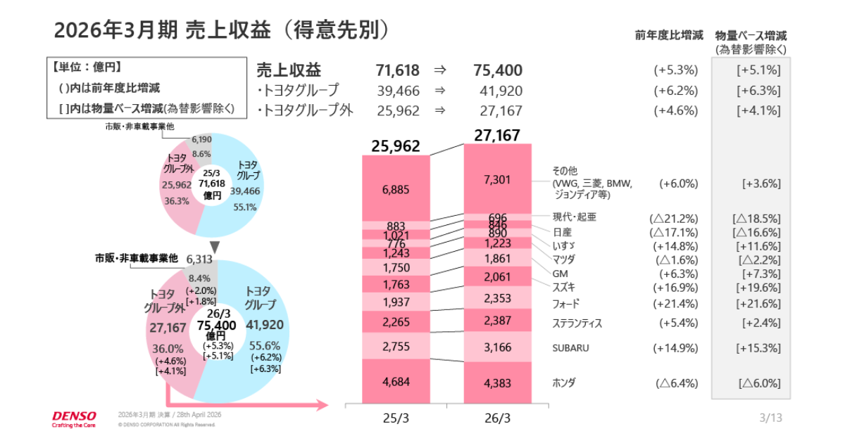 製品別ではモビリティエレクトロニクスの売上が2兆1,987億円(+9.0%)に達し、成長を牽引した。得意先別ではトヨタグループ向けが全体の55.6%を占める4兆1,920億円で増加したほか、スズキ、SUBARU向けも伸長した。