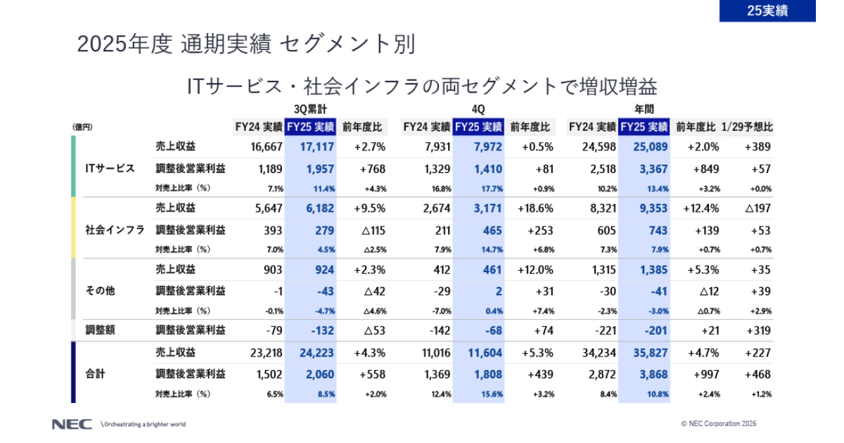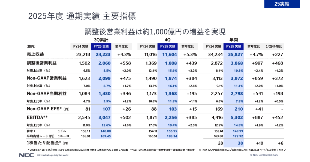 日本電気(以下、NEC)は2026年4月28日、2025年度(2026年3月期)の通期決算概要を発表した。売上収益は3兆5,827億円(前年度比+4.7%)、Non-GAAP営業利益は3,972億円(同+859億円)、調整後営業利益は3,868億円(同+997億円)となった。営業利益率は二桁台まで伸長した。年間配当は1株当たり38円(前年度比+10円)へ増配となった。