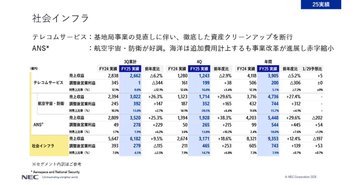 社会インフラ事業ではテレコムサービス領域において、基地局事業の見直しや構造改革を推進。航空宇宙・防衛(ANS)事業は防衛事業の堅調な伸びにより、調整後営業利益は445億円の大幅増となった。