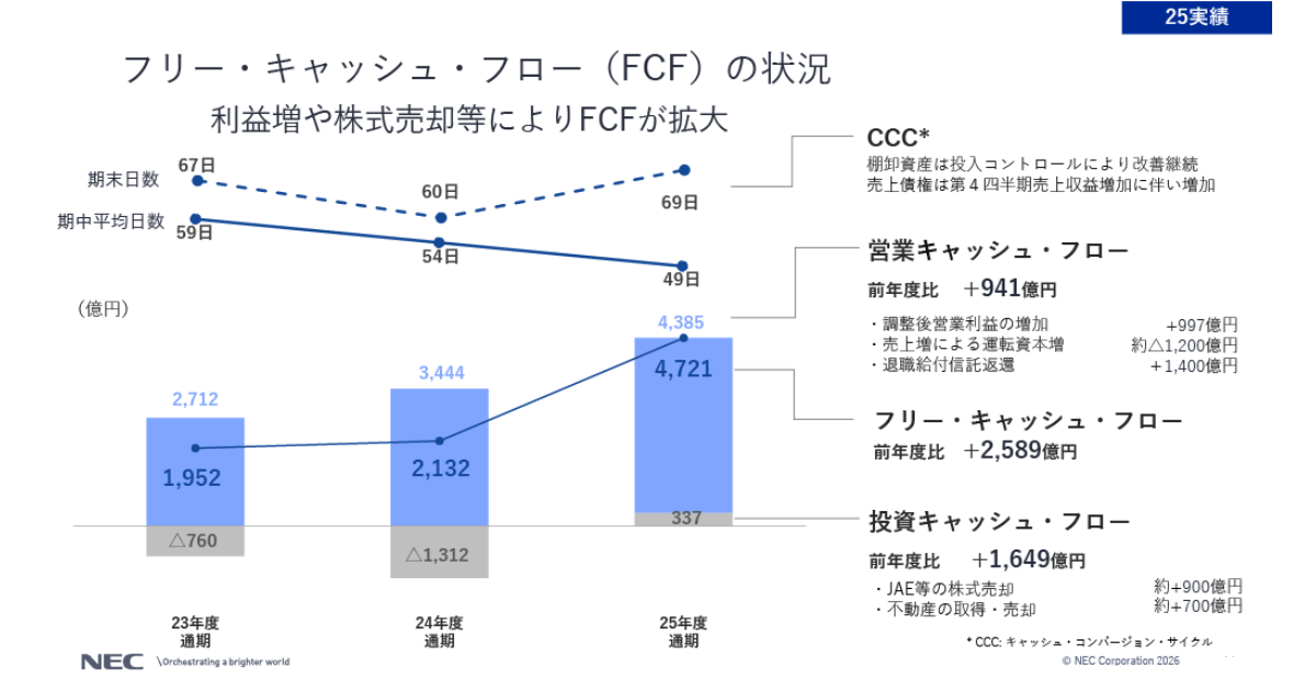 キャッシュ・フロー面も改善し、フリー・キャッシュ・フローは4,721億円(前年度比+2,589億円)と拡大。政策保有株についても縮減方針を進め、累計売却額は1,743億円に達した。また、低収益事業はCFO主導でモニタリングし、自主改善やカーブアウトの方針を策定した。