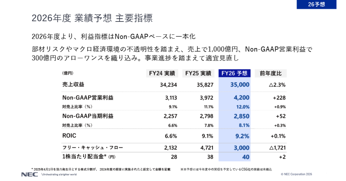 2026年度(2027年3月期)の見通しでは、売上収益3兆5,000億円、Non-GAAP営業利益4,200億円を予想。年間配当は40円へ増額する。マクロ不透明性を見据え、営業利益アローワンスとして300億円を織り込み、テレコムサービス領域の事業再編も実施予定としている。